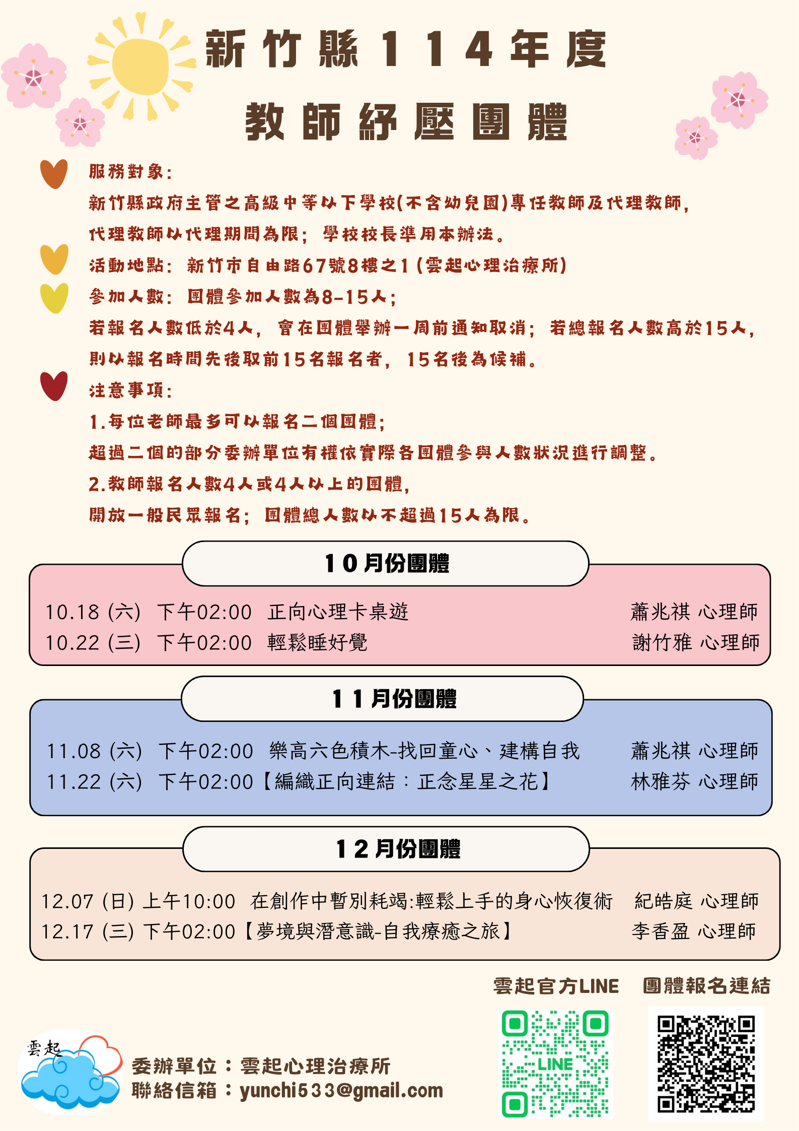 1.為讓更多老師可以參與團體並達成舒壓的目的,每位老師最多可以報名"二"個團體;超過二個的部分委辦單位有權依實際各團體參與人數狀況進行調整。