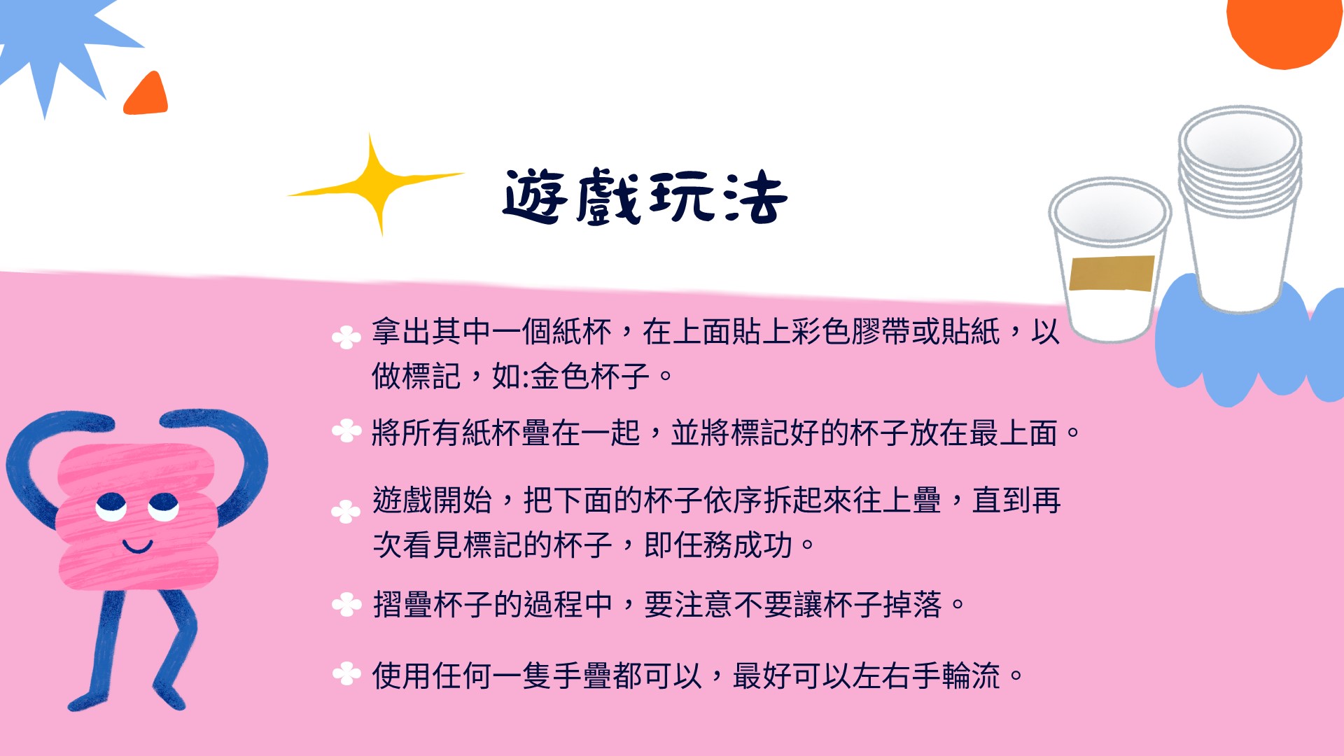 3.遊戲開始,把下面的杯子依序拆起來往上疊,直到再次看見標記的杯子,即任務成功。
