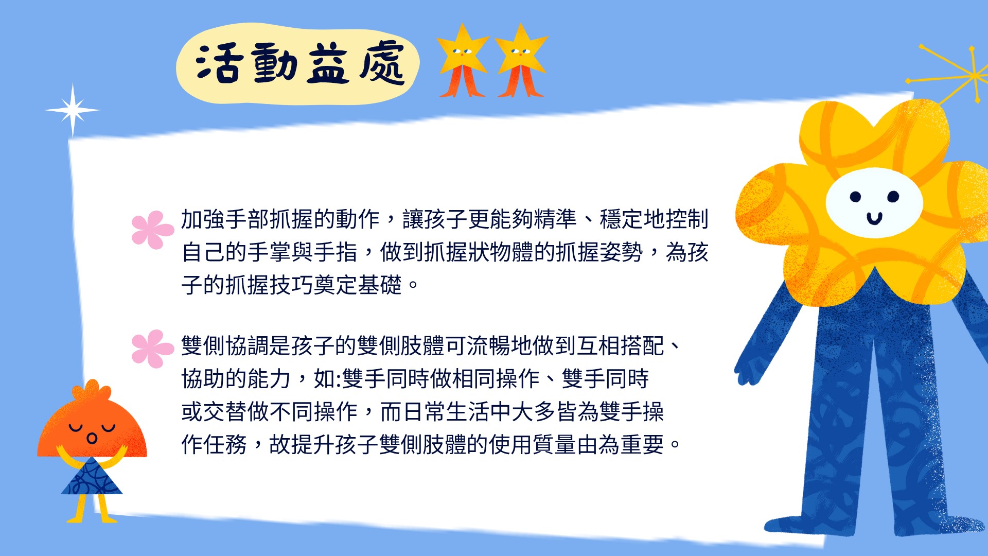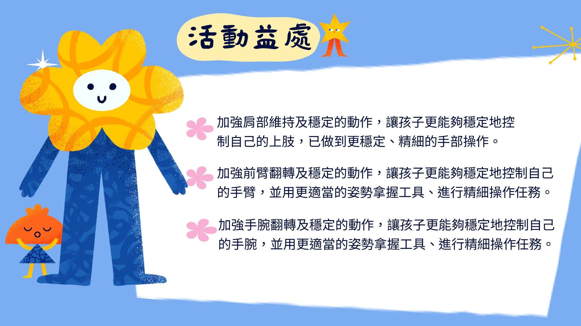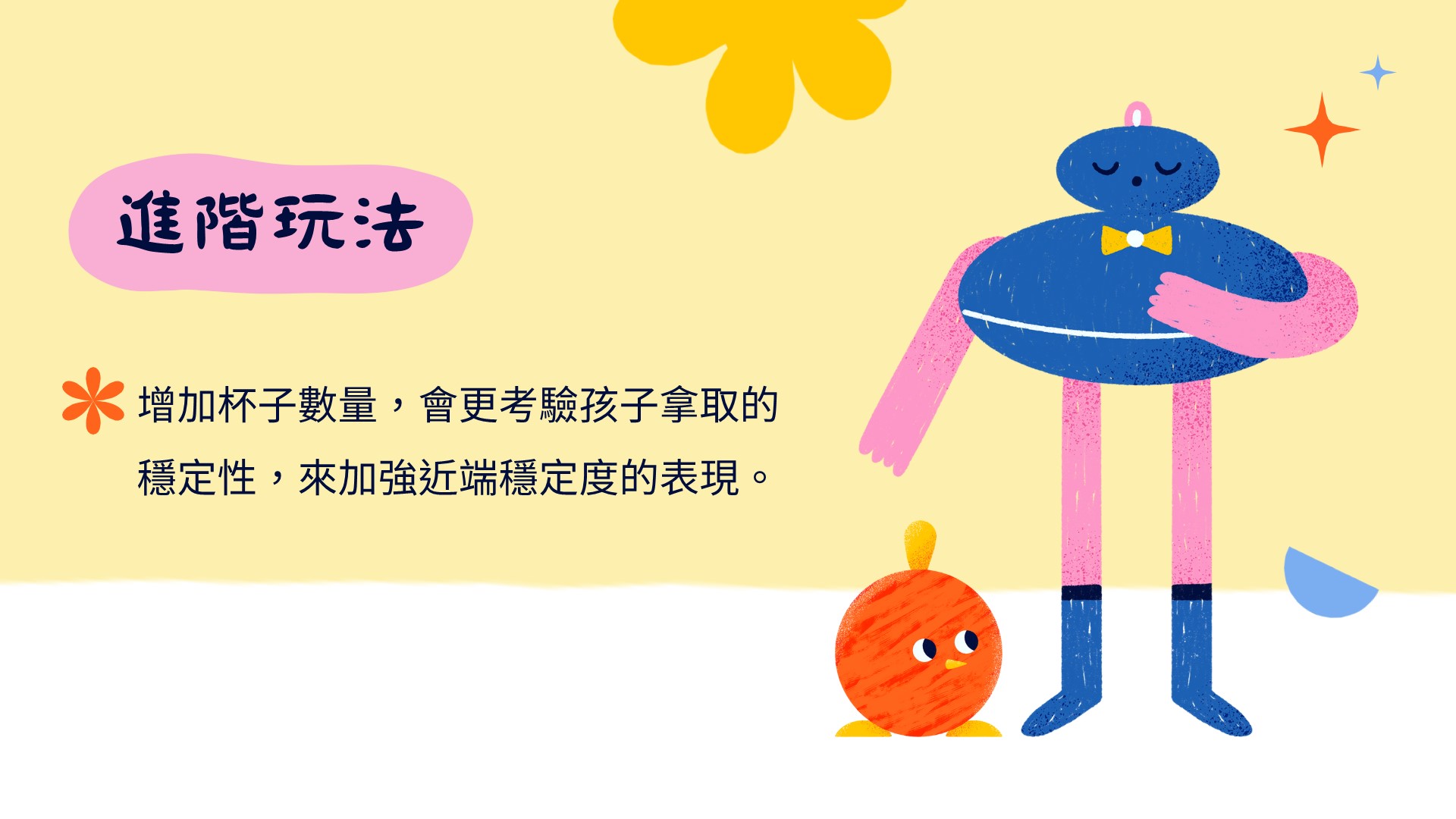 1.增加杯子數量,會更考驗孩子拿取的穩定性,來加強近端穩定度的表現。