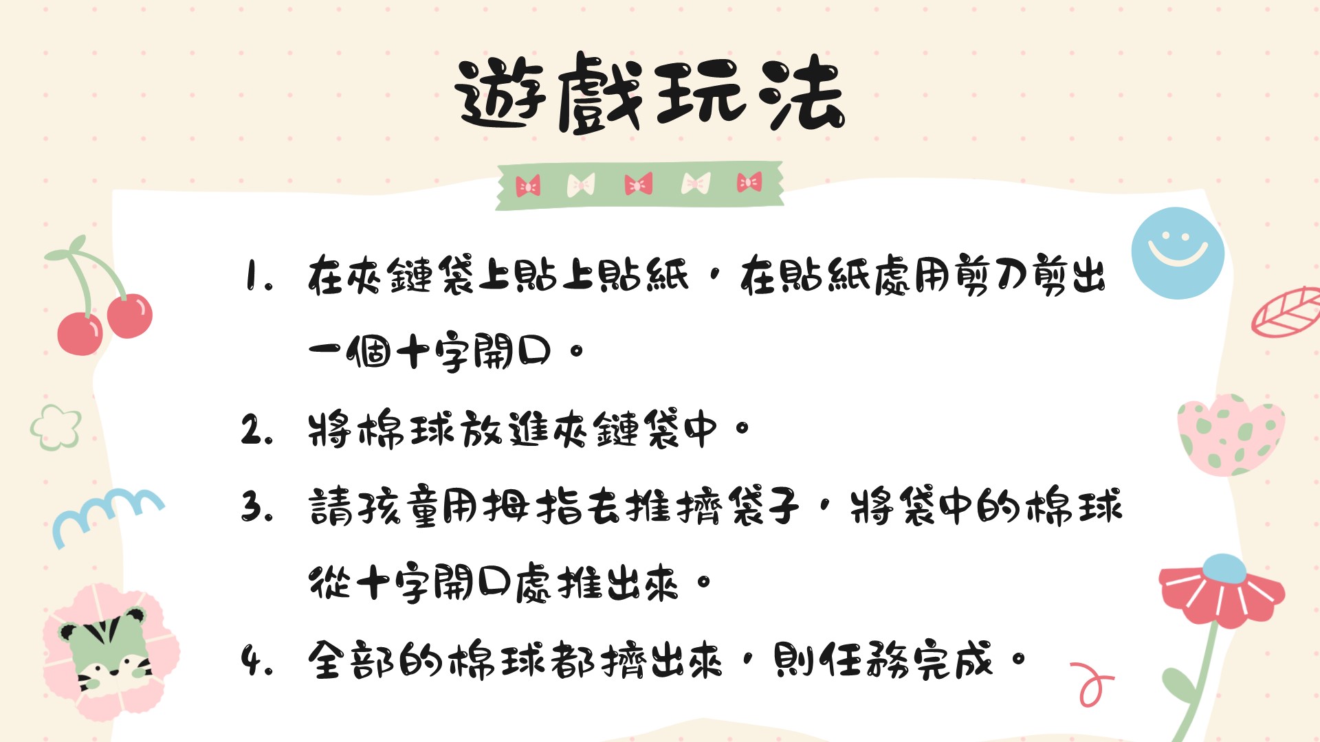 3.請孩童用拇指去推擠袋子,將袋中的棉球從十字開口處推出來。