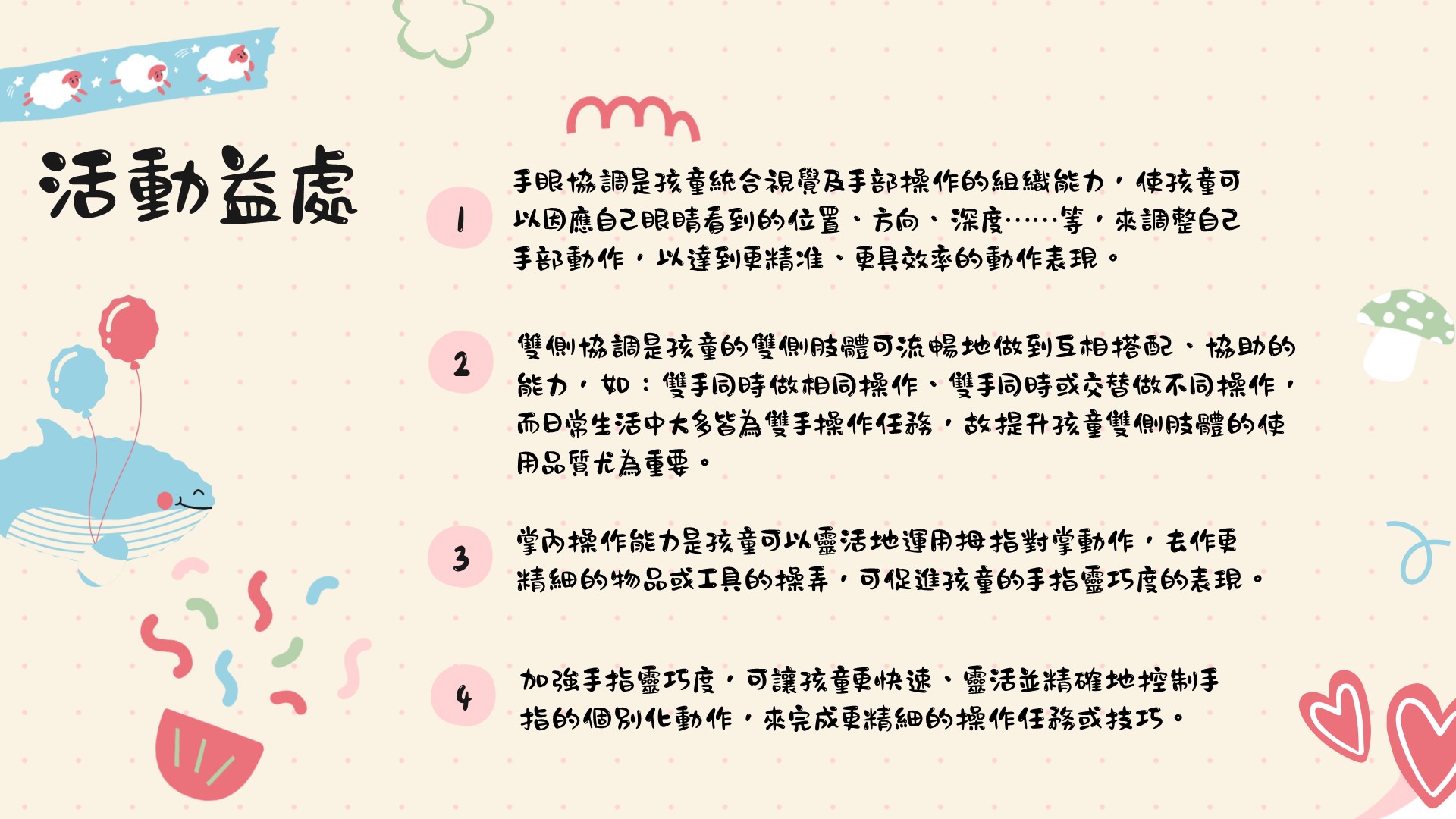 3.困難物品:若使用的物品越小、細、軟,則會更難操作及控制,則更考驗孩童的手指靈巧度。